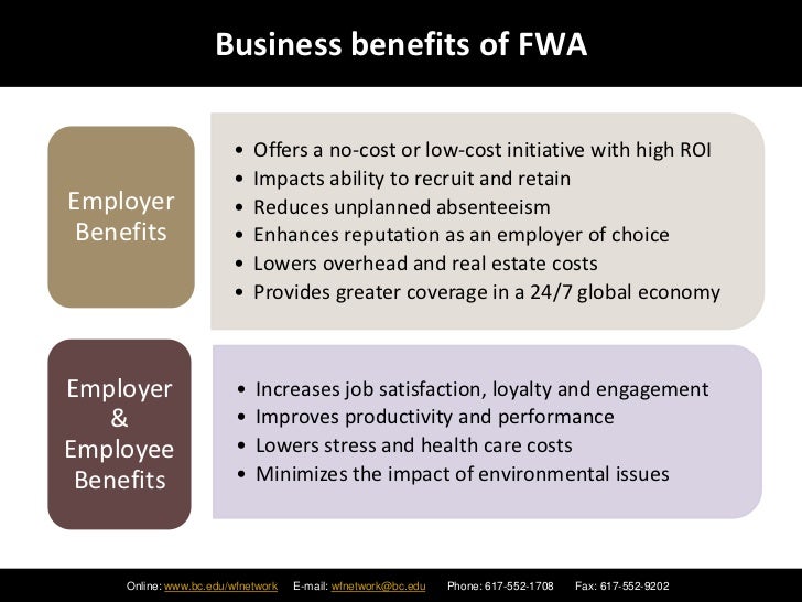 So, what are the benefits for the employer ? Jun In the work environment, flexibility means affording employees the opportunity to. In fact, flexible work hours create a balance between work life and. However, some employers do not recognize the benefits of flexible work.